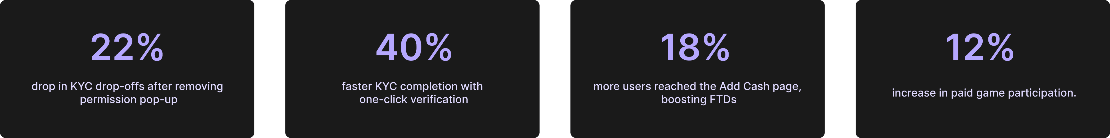 By eliminating unnecessary friction, the new flow ensured that users could quickly verify their accounts, deposit money, and start playing games without hesitation—leading to an overall improvement in user retention and revenue.