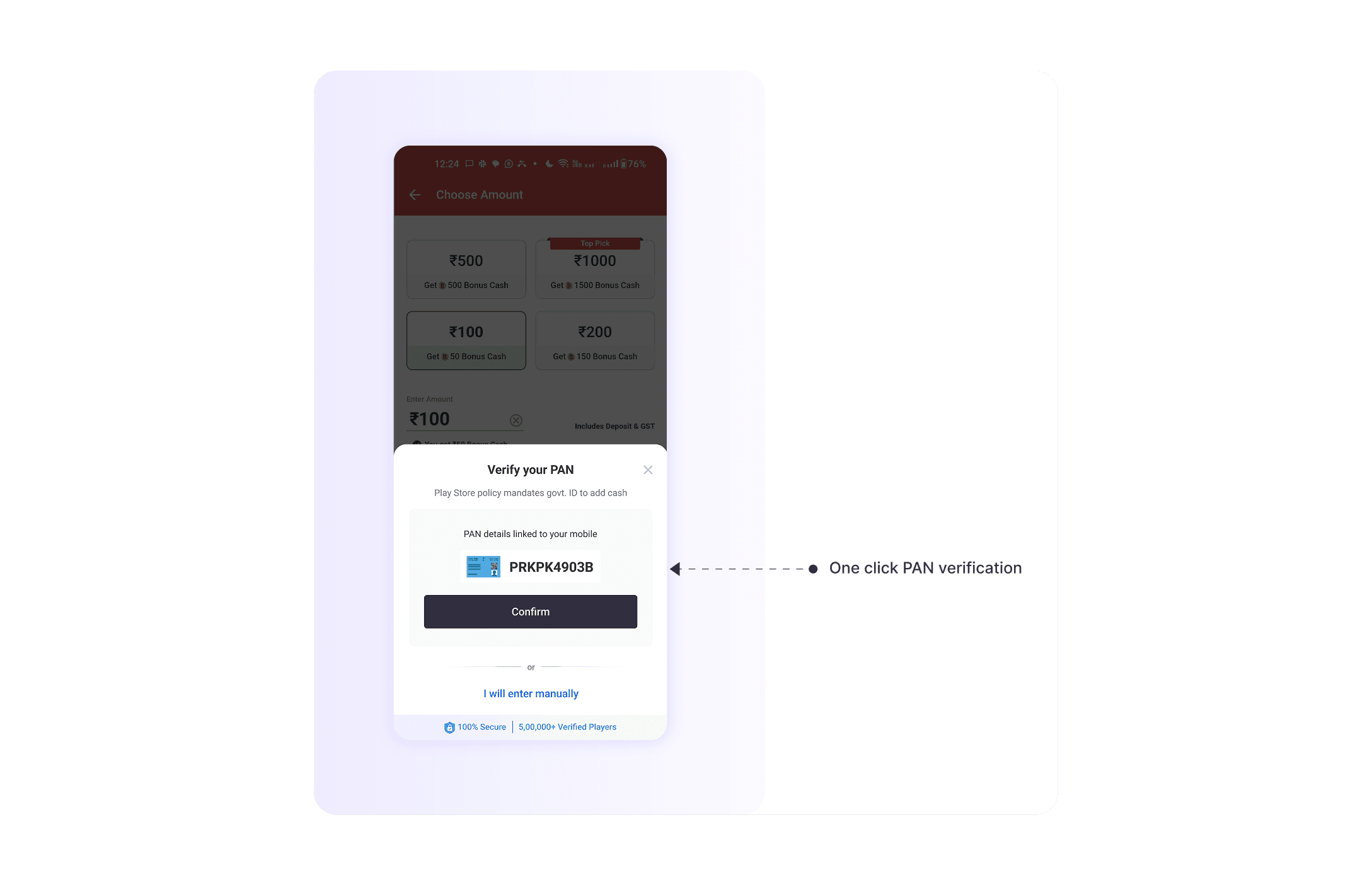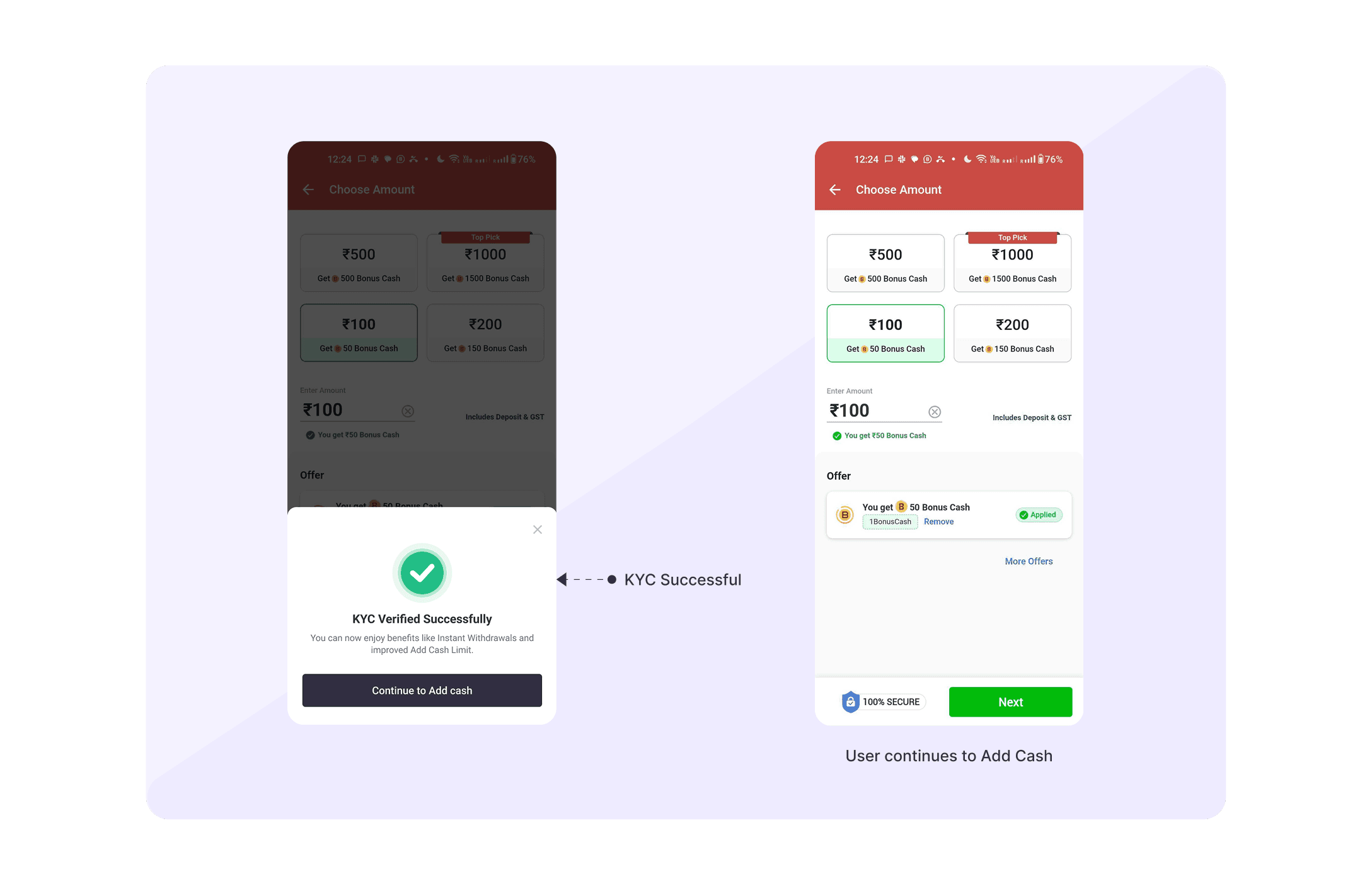 Once the user confirms their details, a success message appears, assuring them that KYC is done instantly. After KYC success, the user is automatically redirected to the Add Cash screen, reducing friction and guiding them toward the next step. With no KYC barriers, users add cash and start playing games smoothly without any roadblocks.